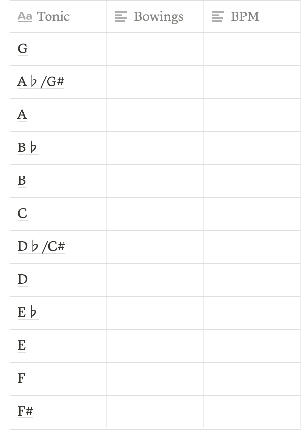 A Notion template by Valeri Speights to track long-term progress through The Heifetz Scale Book by Endre Granat. Like the book, the pages of the database are organized by tonic. In this way, when you are focusing on one tonic at a time, it is easy for you to have the tonic page open and check off the boxes as you go through. The database can be duplicated & easily cleared when it is time to restart. Enjoy!